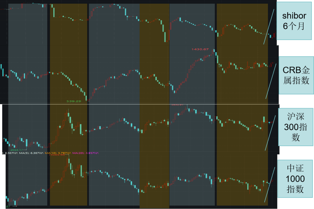 横轴是时间,不同颜色的竖条代表不同的年份,都已标注好。一共是4个品种,第一张图是shibor6个月利率,可以认为是广谱利率的代表,上涨代表经济上行,下跌代表经济下行。第二张图是CRB金属指数,也就是商品指数,CRB系列指数都是国外的,之所以用国外的指数是因为受到的政策干扰较少。上涨代表实体经济上行,下跌代表实体经济下行。第三张图是沪深300指数,第四张图是中证1000指数,这两张图都是老朋友了,大家应该都很熟悉。